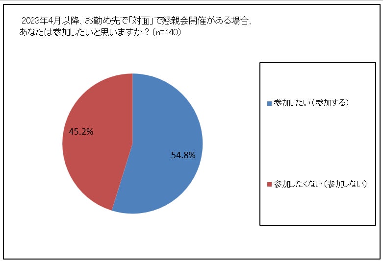 IKUSAが2023年4月に独自で調査した、懇親会に関するアンケートでは、「2023年4月以降、お勤め先で”対面”で懇親会開催がある場合、あなたは参加したいと思いますか?」という質問に対し、54.8%が参加したい、45.2%が参加したくない(しない)と回答しております。