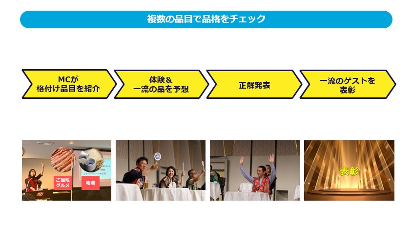 ご当地格付けバトルは、見たり嗅いだり食べて「一流の品」を見極めるお馴染みのゲームを社員旅行・報奨旅行中の余興向けにアレンジした体験型クイズコンテンツです。