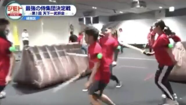 本イベントは、弊社が開発した合戦アクティビティ「チャンバラ合戦」の日本一を決めるイベントです。5人1組でチームを組み、スポンジ製の刀を使って、腕につけたカラーボールを落とし合います。